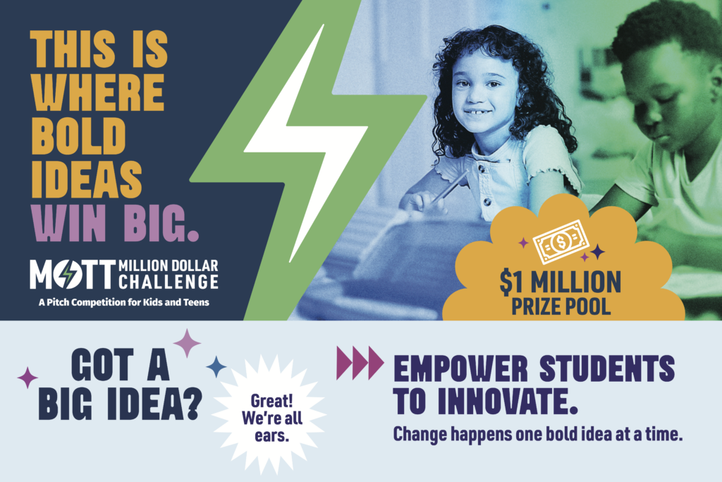 Over the past decade, the Mott Foundation has supported organizations, including NFTE, YEI and VentureLab, to expand entrepreneurial experiences for young people by integrating entrepreneurship education into afterschool programming. The organizations collaborated with the Mott-funded 50 State Afterschool Network to help make this possible. From 2018 to 2024, more than 900,000 students participated in entrepreneurship programs supported by the Foundation. Students, parents, educators and youth program leaders can find submission instructions, resources and other key information for the Mott Million Dollar Challenge at: mottmillion.org. The deadline to submit ideas is Feb. 27, 2026.